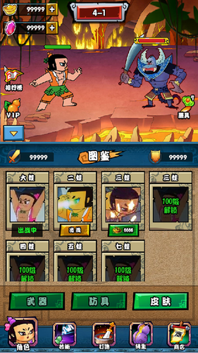 游戏采用章节推进式地图设计,每个关卡对应原著剧情节点。通过收集灵珠可激活角色潜能,当大娃力量突破临界值时,可解锁撼地神拳特殊技。装备淬炼系统支持百种组合方式,玄铁套装与藤甲防具可产生特殊羁绊效果。