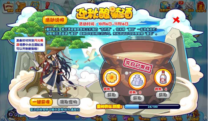 当累计获得100点酿酒值后,即可解锁重阳限定宠物。建议每日完成基础任务,预计5日内可达成最终奖励。若遇到材料配比问题,可关注游戏内公告栏查看最新玩家攻略分享。
