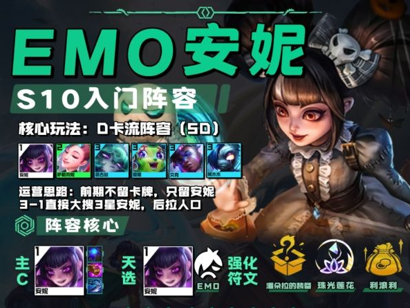 云顶之弈S10赛季如何运营EMO安妮阵容?核心装备如何搭配?随着版本更迭,S10赛季的战术体系迎来全新变革。以EMO羁绊为核心的安妮阵容凭借其独特的技能机制,成为当前版本上分利器。本文将深入解析该阵容的运营策略与装备选择方案,助力玩家快速掌握制胜技巧。