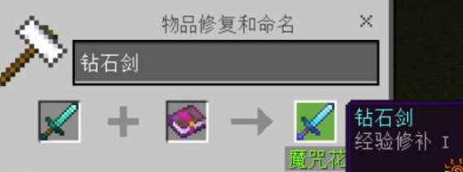 2、界面操作分为两个区域:左侧装备槽位放入需要强化的物品,中间附魔书槽位放置经验修补卷轴。此时右侧结果栏会显示带有闪光特效的成品预览,确认无误后点击完成合成。