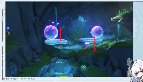 7. 观察水面波纹动态,当升降平台与气泡发生器处于同一水平面时,使用甘雨/宵宫等弓箭手精准射击左侧气泡装置,同步处理右侧自动触发的波纹连锁反应