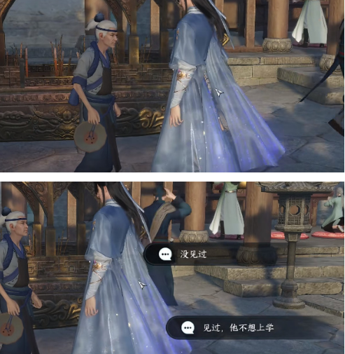 3、在孔庙正殿前会遇到金似颜的父亲金员外,与其对话时将出现三个选项分支。此处必须选择【见过,他不想上学】才能推进剧情,若误选其他选项需等待两刻钟(现实时间5分钟)后重新触发对话。